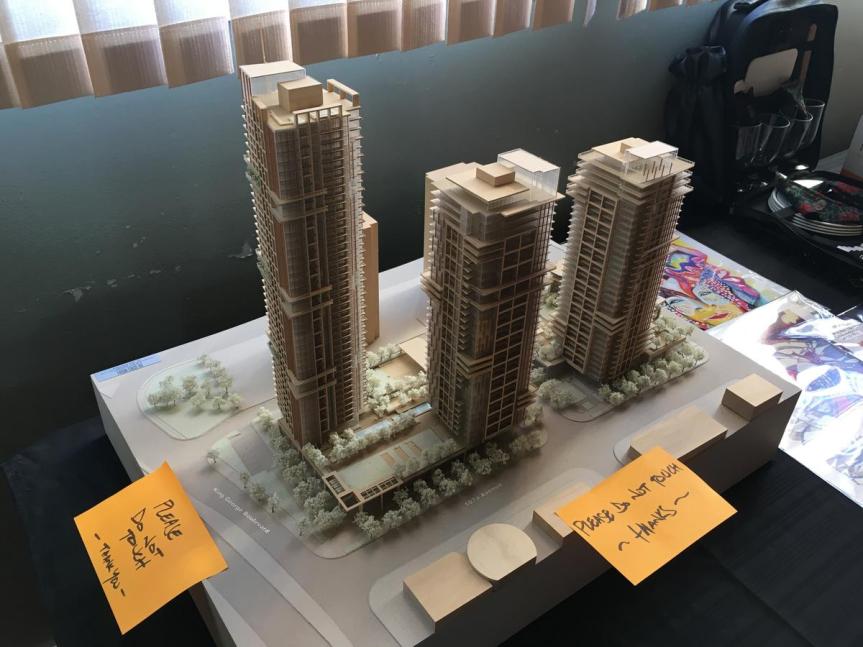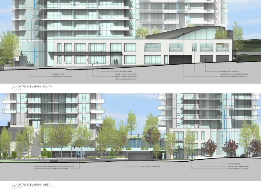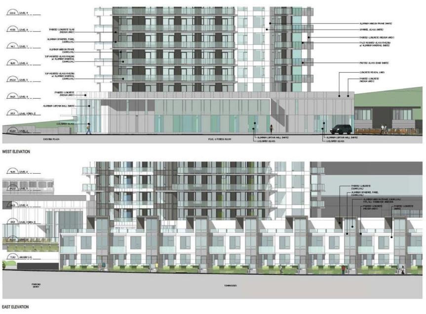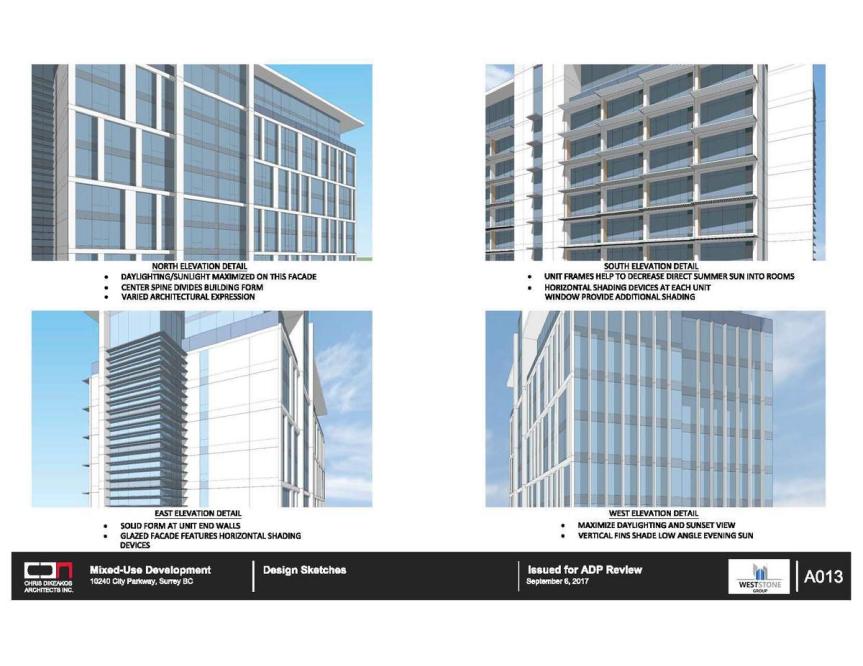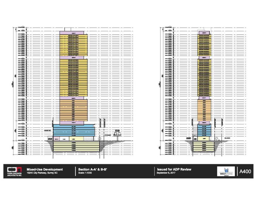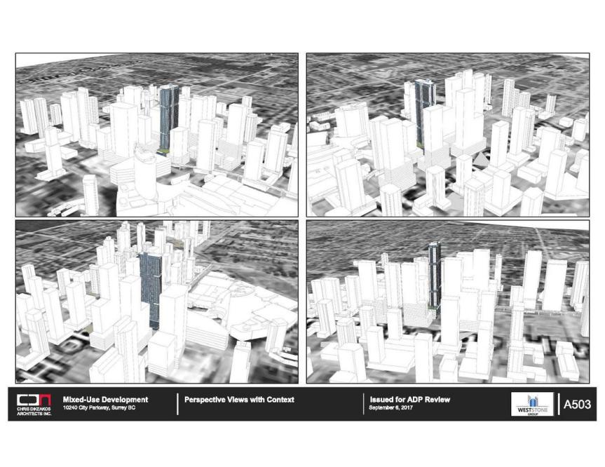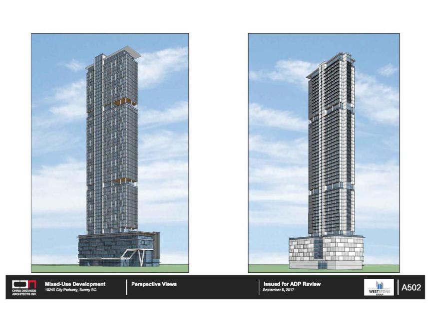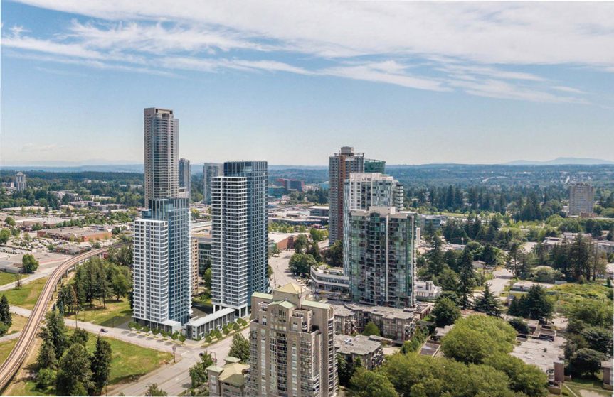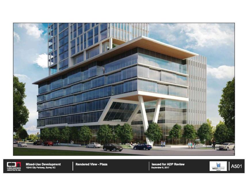 The remaining buildings, subject to future Detailed Development Permit applications, will be located further east along 104 Avenue and north along 105 Avenue. The tallest of the towers, the 50-Storey mixed-use building with 17-Storey office podium, would become the new tallest in Surrey once complete, assuming no other building surpasses it by then, at 554 ft. (169m). The two future low-rise amenity, and market-hall buildings located in the centre of the site are to be set within a publicly accessible plaza that will invite people into the site from 104 Avenue. The plaza will be activated by retail and restaurant spaces at grade, as well as landscaping, and public art, subject to future detailed design.