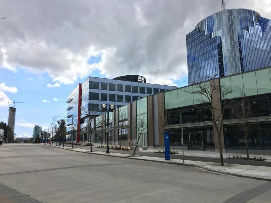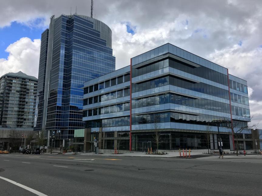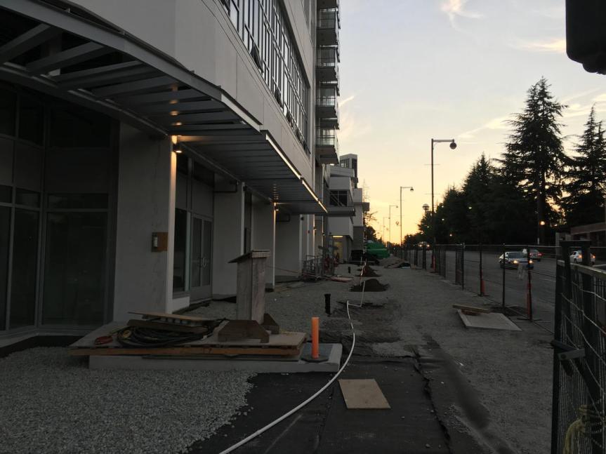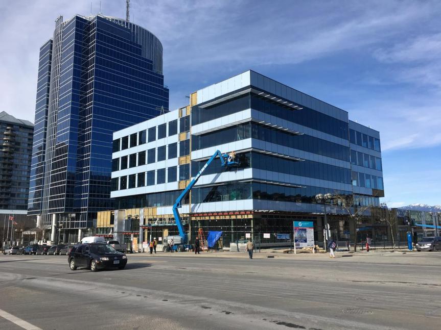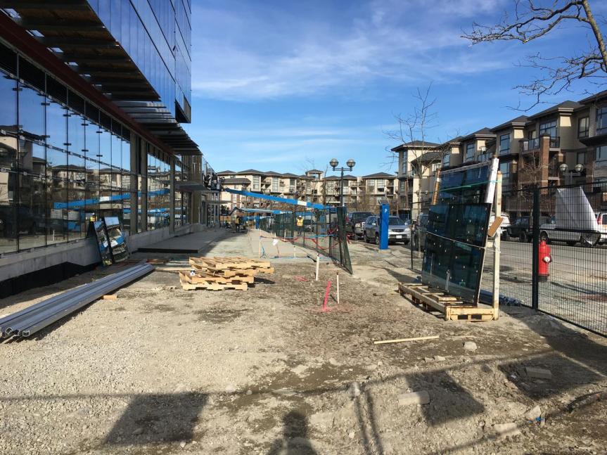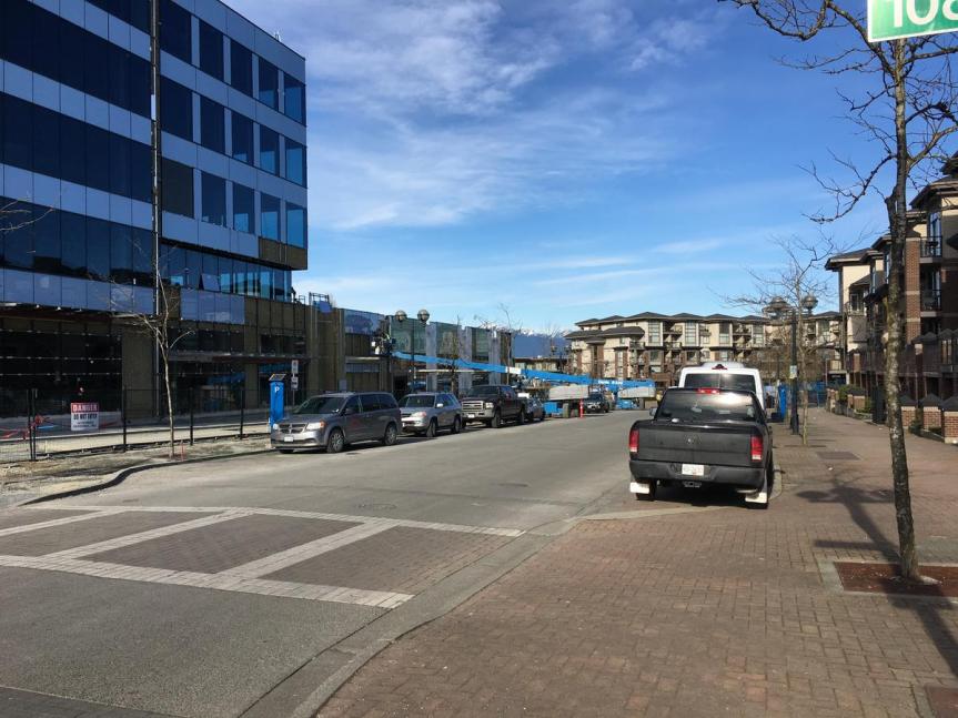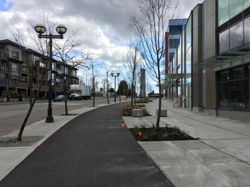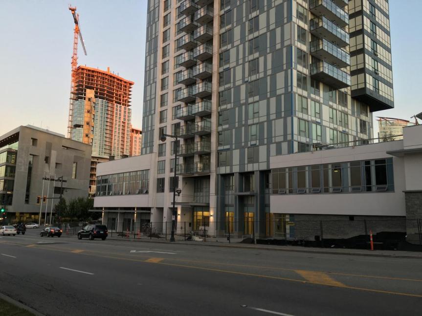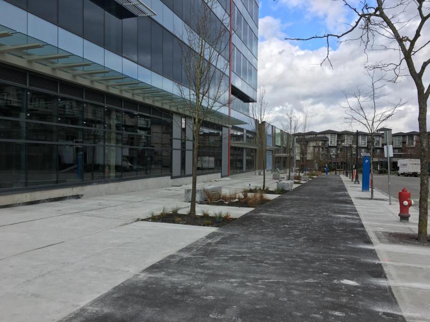 In addition to the building itself, the development has contributed to a new high quality streetscape along University Drive with grade-separated bike lanes, benches, and a temporary corner park at 102 Avenue. The grassed corner will remain until 102A Avenue is eventually re-aligned through that space and the Surrey Central Bus Loop, as per the City Centre Plan.