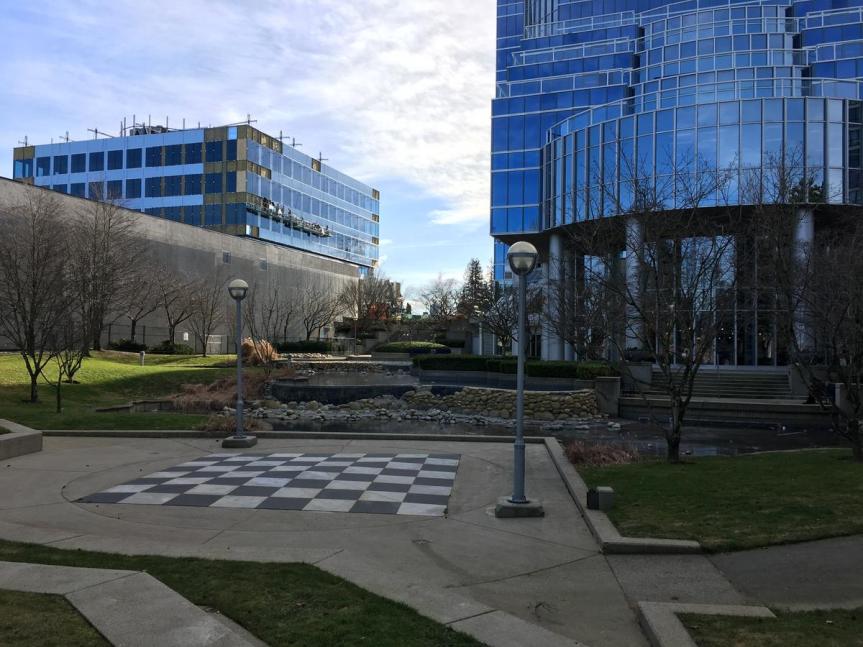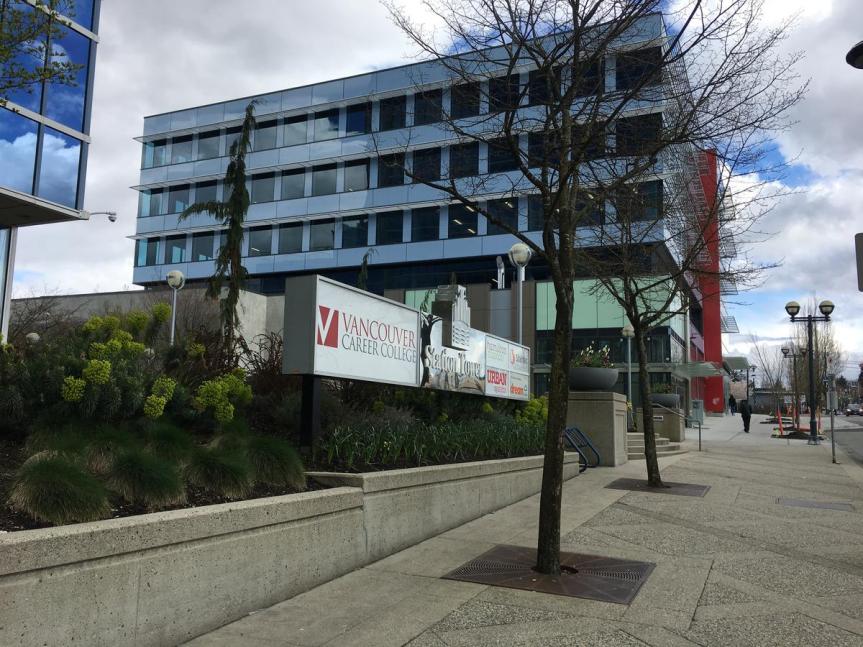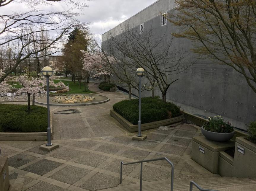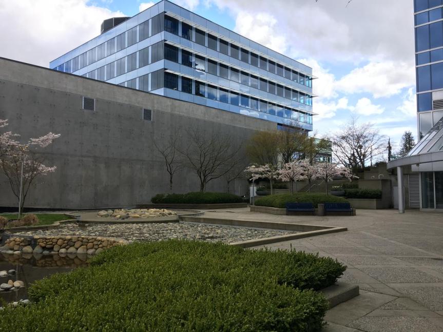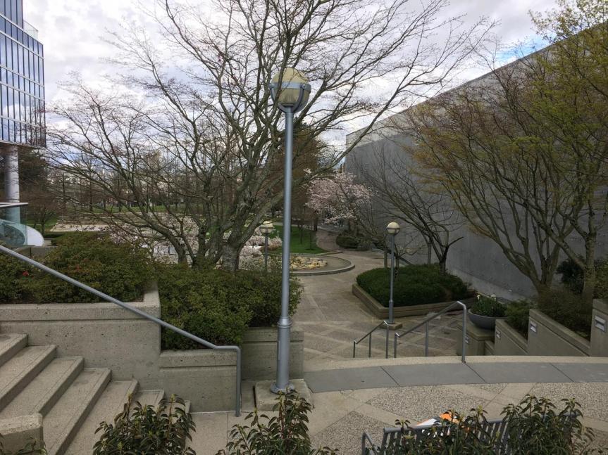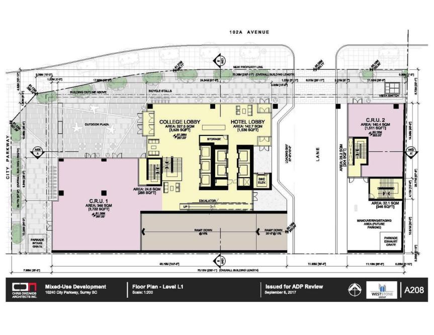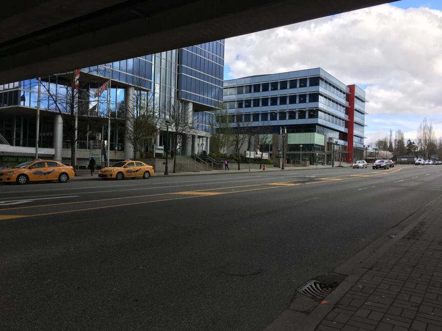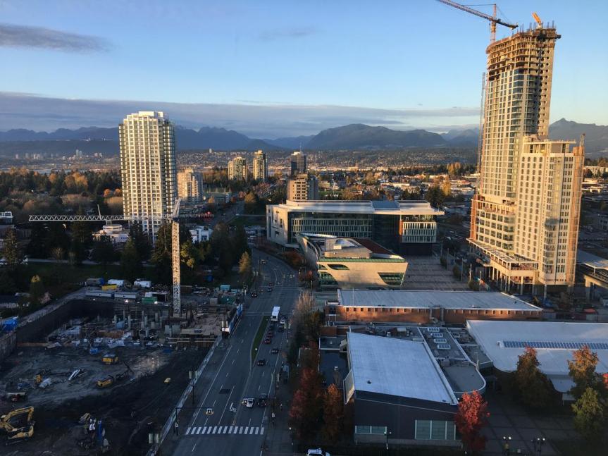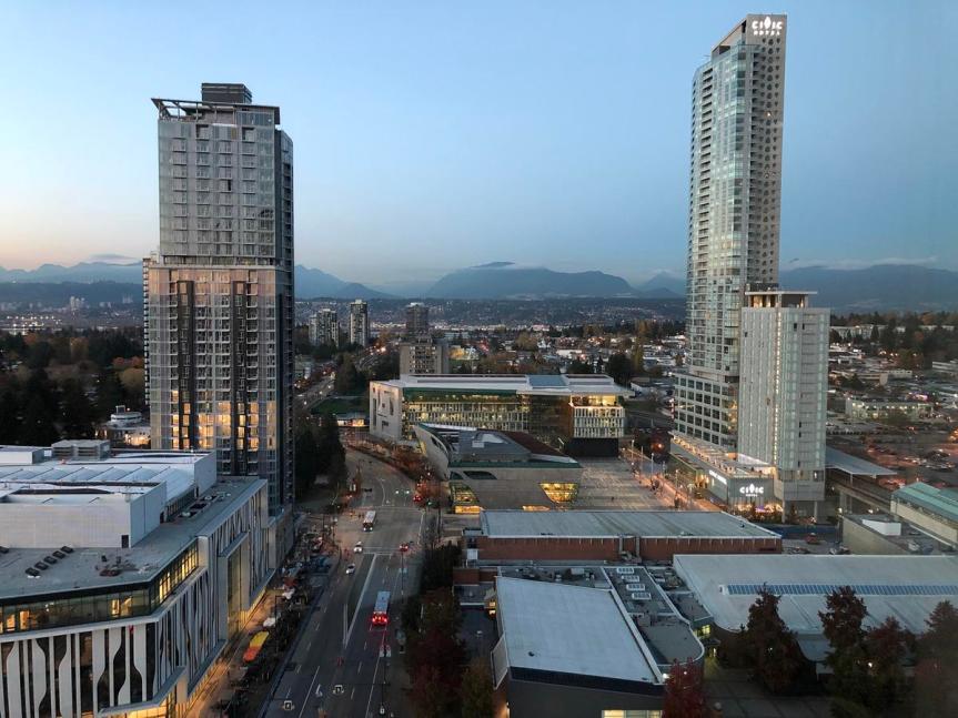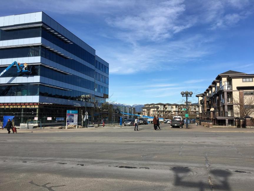 In addition to the building itself, the development has contributed to a new high quality streetscape along University Drive with grade-separated bike lanes, benches, and a temporary corner park at 102 Avenue. The grassed corner will remain until 102A Avenue is eventually re-aligned through that space and the Surrey Central Bus Loop, as per the City Centre Plan.