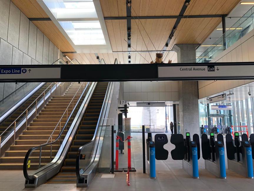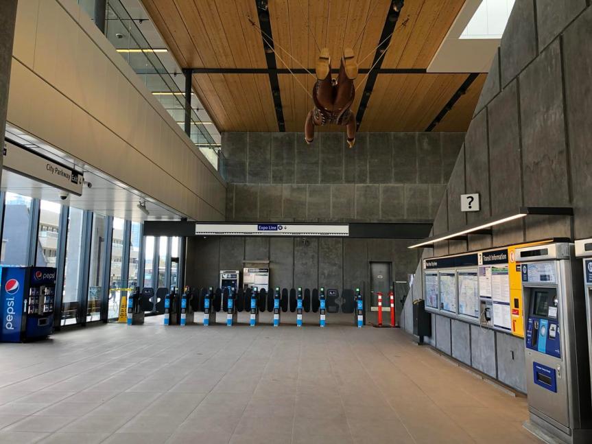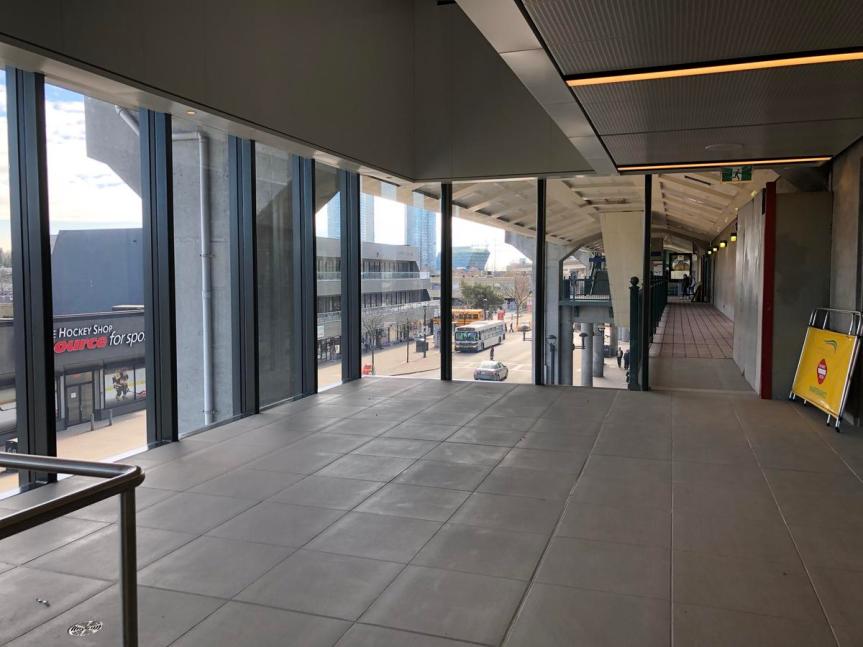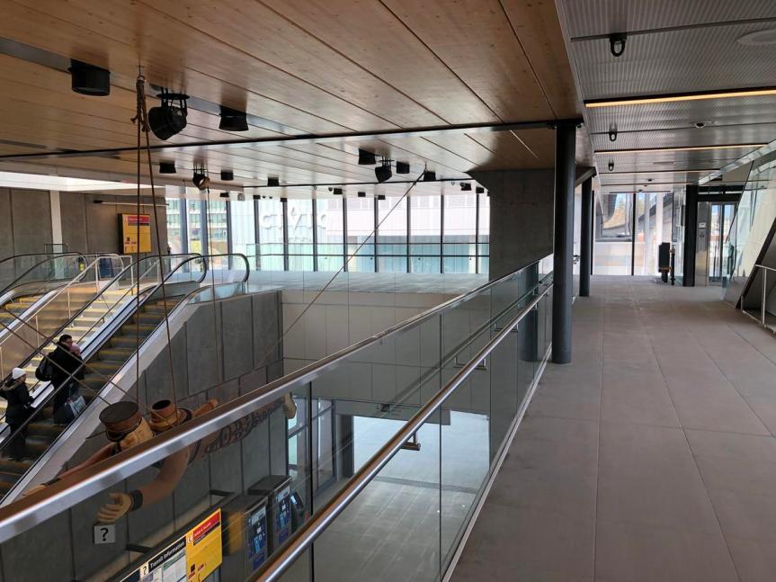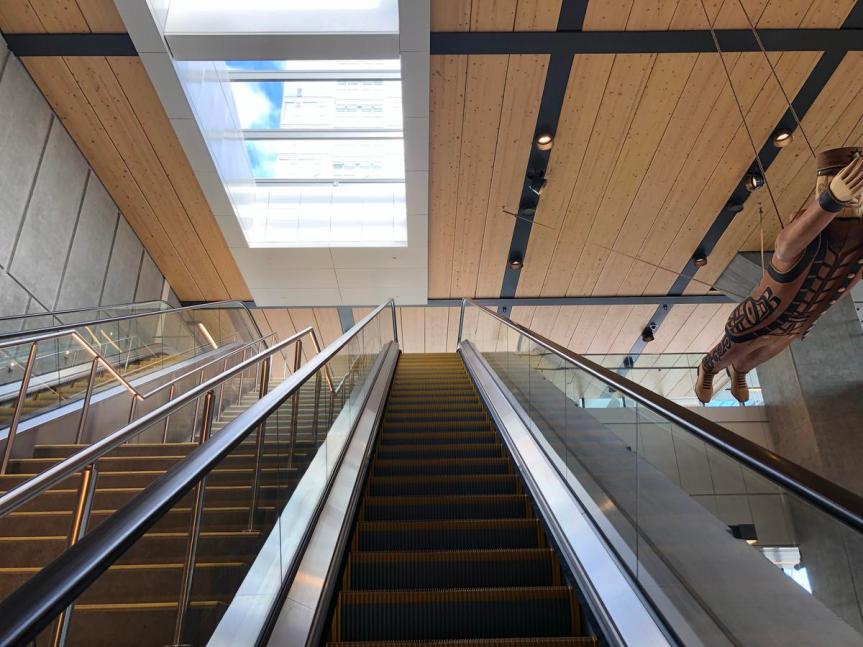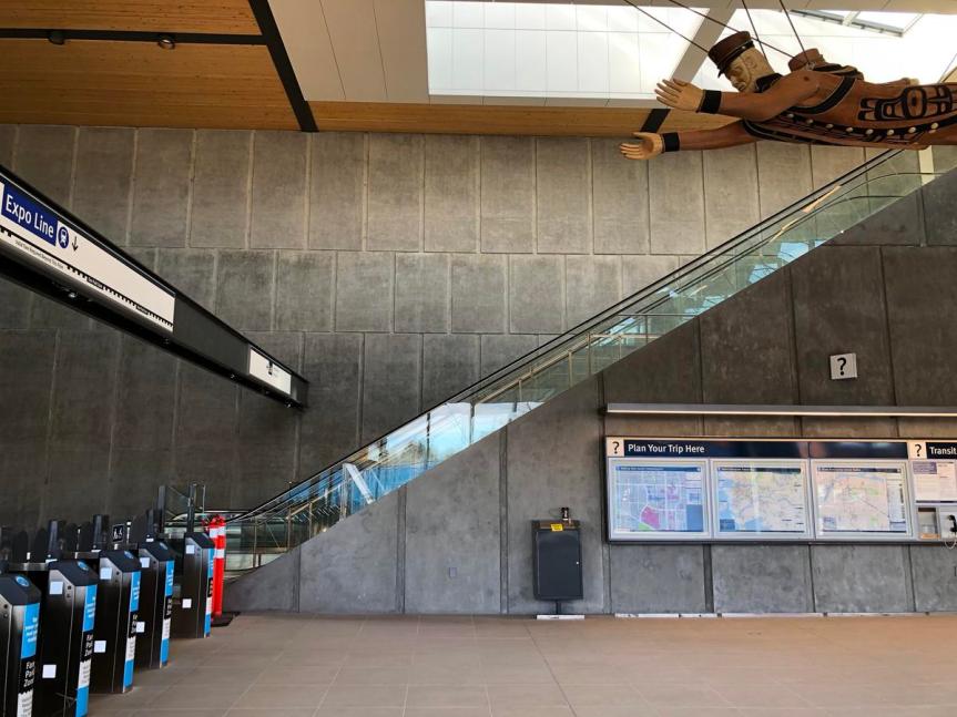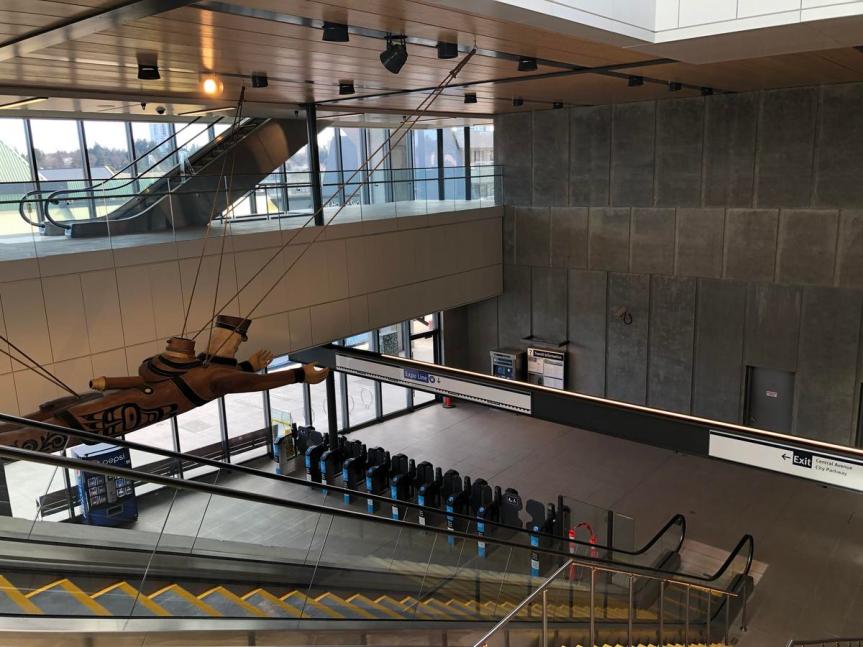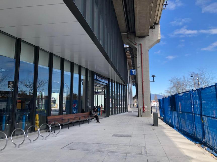 The new station house features a contemporary, open, and airy design consisting of glass, concrete, and wood materials, as well as a prominent new First Nations art installation suspended from the ceiling – ‘The Sea Captain’ by Marianne Nicolson. A new retail unit has also been added to the station next to the entrance fronting Central Avenue, but has yet to be occupied by a tenant.