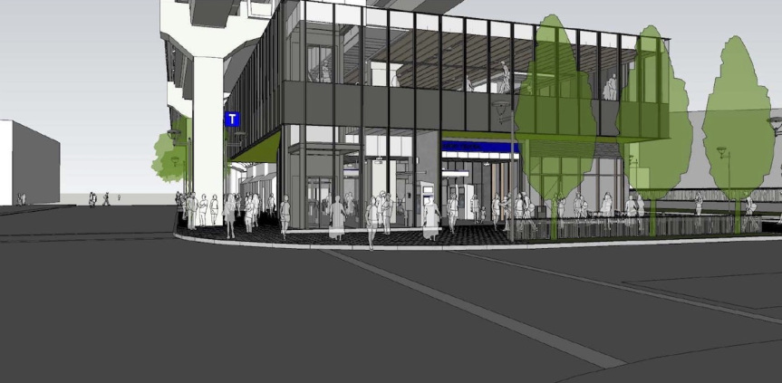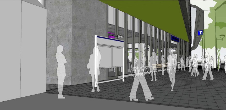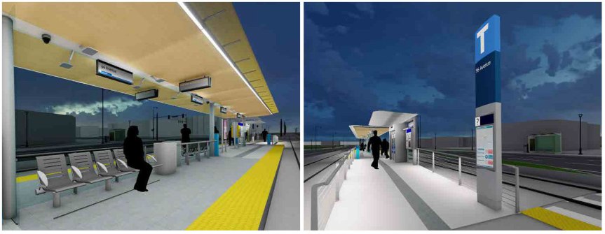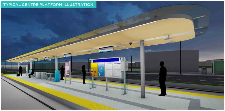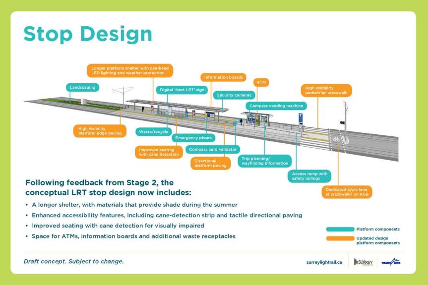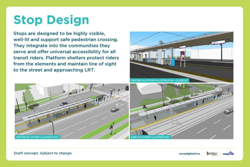 Overall, stations are designed to be highly visible, well-lit, and well integrated into the community – accessible by well-marked pedestrian crossings providing universal accessibility for all riders. Lengthy platform shelters protect riders from weather, and include space for ATM’s, information boards, seating, and more – while maintaining a clear line of sight to the street and approaching trains. Stations will in most cases be located in the centre median of the street, with the exception of King George, Surrey Central and Newton Town Centre – where they will be plaza oriented, or off to the side. Public art will also be integrated into stations along the route.