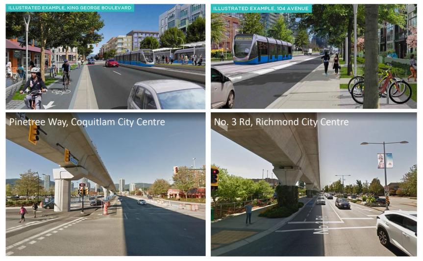 In Surrey, the 104 Avenue and King George Highway corridors that make up the ‘L’ line are much better suited to urban-style LRT than SkyTrain. Not only is this route more localized than regionally serving, but SkyTrain just doesn’t make sense from a cost perspective, and the impacts that such guideways would have on the streetscapes. Looking at a comparison between SkyTrain guideways in Richmond City Centre and Coquitlam City Centre, it is clear to see how much better LRT integrates with the streetscape and community it passes through, rather than bisecting it with an obtrusive, shadowing, and noisy concrete structure. LRT can transform a streetscape into an inviting, pedestrian friendly, vibrant urban environment – whereas SkyTrain does the opposite.