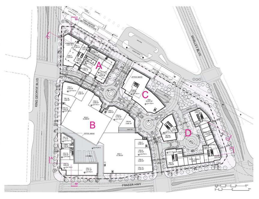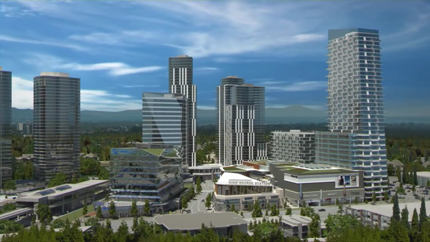Perspective along King George Blvd – Rental Residential Tower (Left), Office Mid-Rise (Right), and 2-Storey Retail / Market Hall Podium