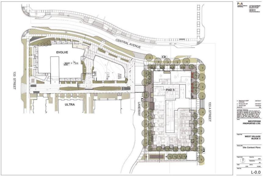 Revised Master Plan for West Village. Evolve currently under construction on Parcel 4 and subject proposal shown on Parcel 5.