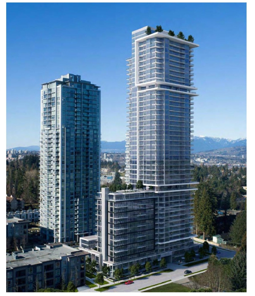 As per a recently released rendering of the project by Adessa Visuals, and application details from the City of Surrey, the project is now proposed as a 46-storey tower above a 14-storey podium. The significant massing of the project is a departure from early plans for the site, which showed a tower above a commercial/retail podium similar to the under construction Evolve next door. Early plans also showed a small plaza/park space on the southern portion of the site, which has now been replaced by the 14-storey podium, covering the entire site.