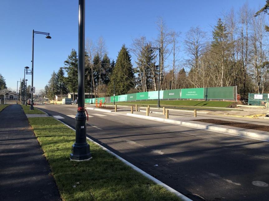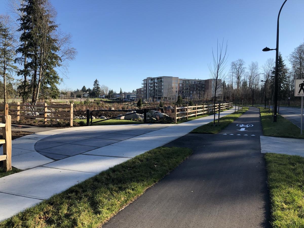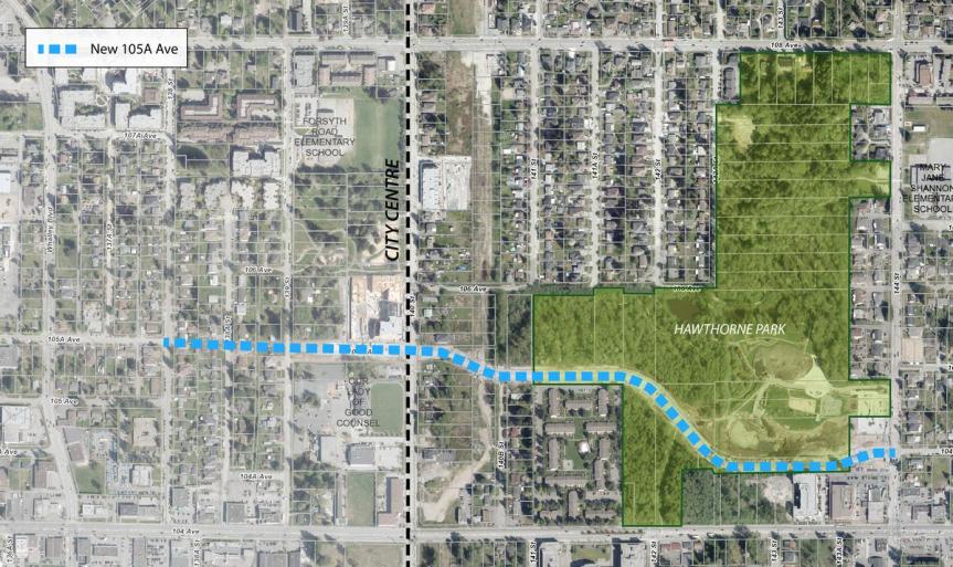 New 105A Ave though Hawthorne Park with sidewalk, bike-lane, and roadway