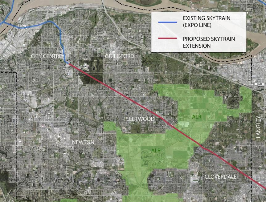 SkyTrain extension to Langley along Fraser Hwy through low density suburbs / ALR to Langley