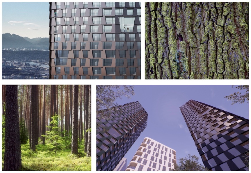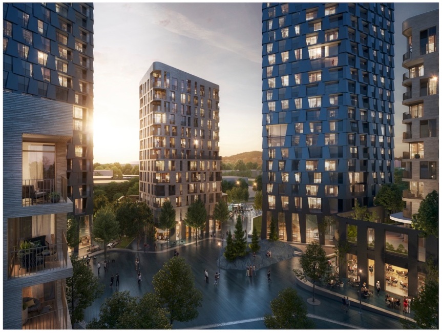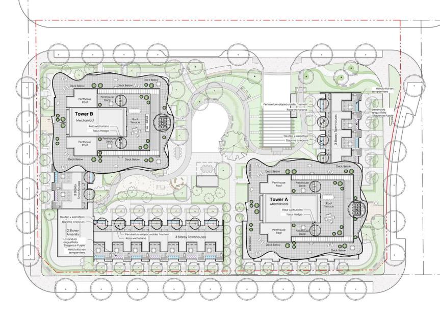 Proposed site plan with unique angular floor plates and substantial green roofs