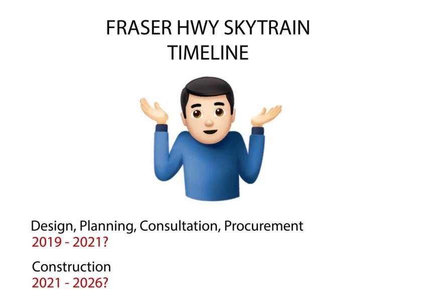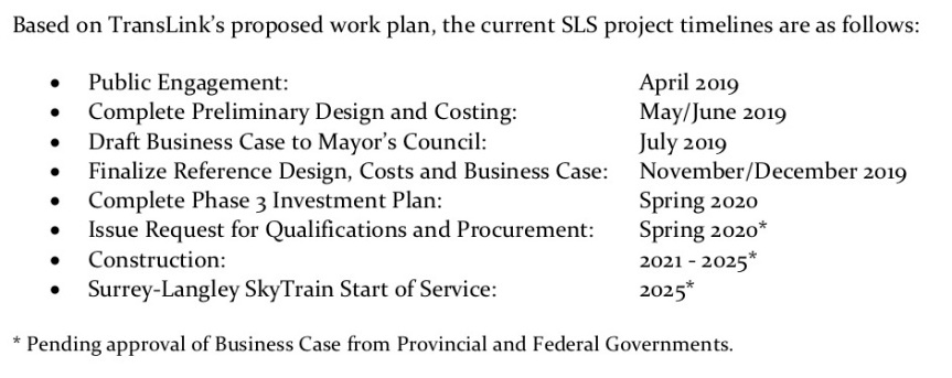 Despite the funding and timeline uncertainties, planning work is nonetheless well underway for the new SLS line, which will need to involve a significant re-evaluation of land-use plans along the Fraser Highway corridor to support SkyTrain, completion of a number of supportive studies, and extensive Public Consultation. In a project update report to Surrey Council this week – a preliminary timeline was given for this work by TransLink, with start of service targeted for 2025.