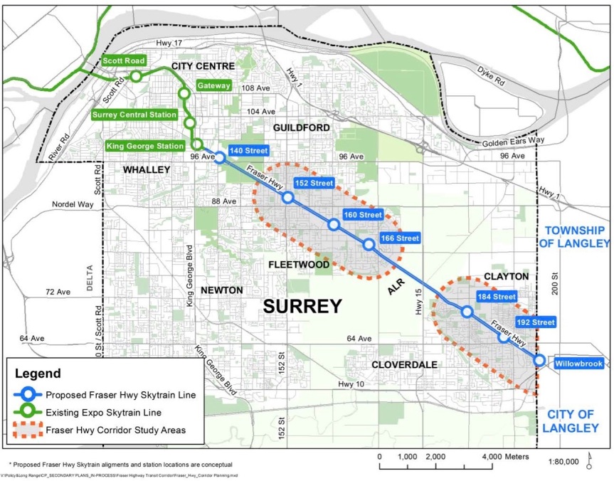 With yesterday’s Mayors Council vote in favour of finalizing the business case for the Surrey-Langley SkyTrain project, it is now certain that SkyTrain will be extended along Fraser Highway, but only as far as Fleetwood within the foreseeable future. As expected, the 1.65 billion in funding currently secured for rapid transit in Surrey will only allow for a 7km / 4 station extension of the Expo Line from King George Station to 166 Street, not to be in service until the end of 2025. With no funding secured, and no timeline in place for a phase 2 extension to Langley, it’s unlikely that SkyTrain will reach Langley before the 2030’s.