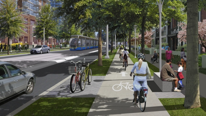 Roadway design for King George Blvd will retain 2 traffic lanes in each direction while allowing for LRT in the median for the majority of the route. Sections of King George in City Centre will see LRT routed off to one side. New separated bike lanes, enhanced sidewalks, and pedestrian crossings will also be a key component of the re-designed King George.
