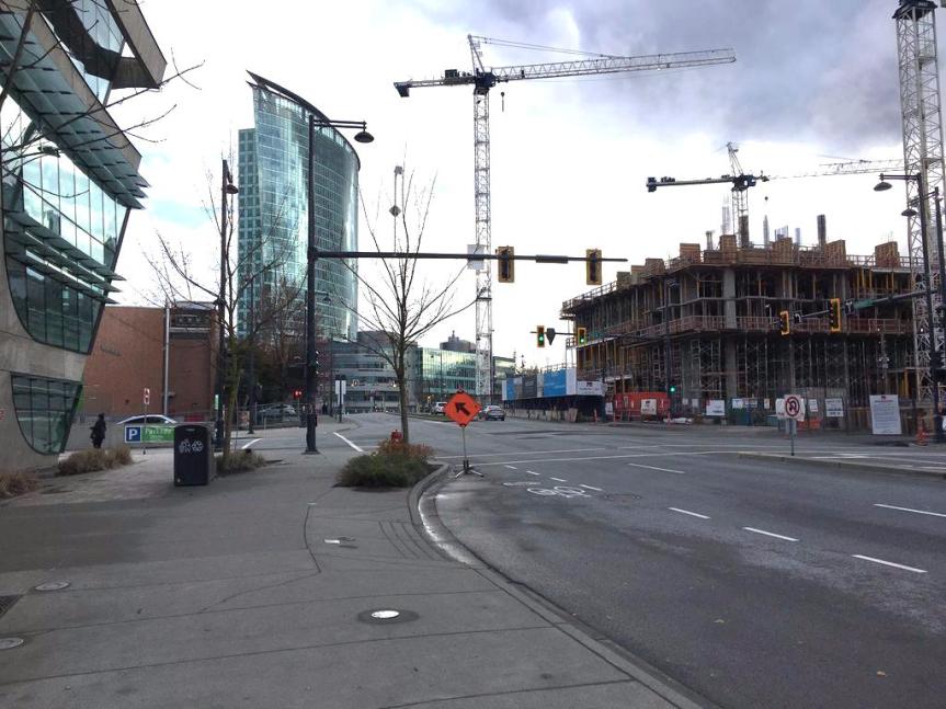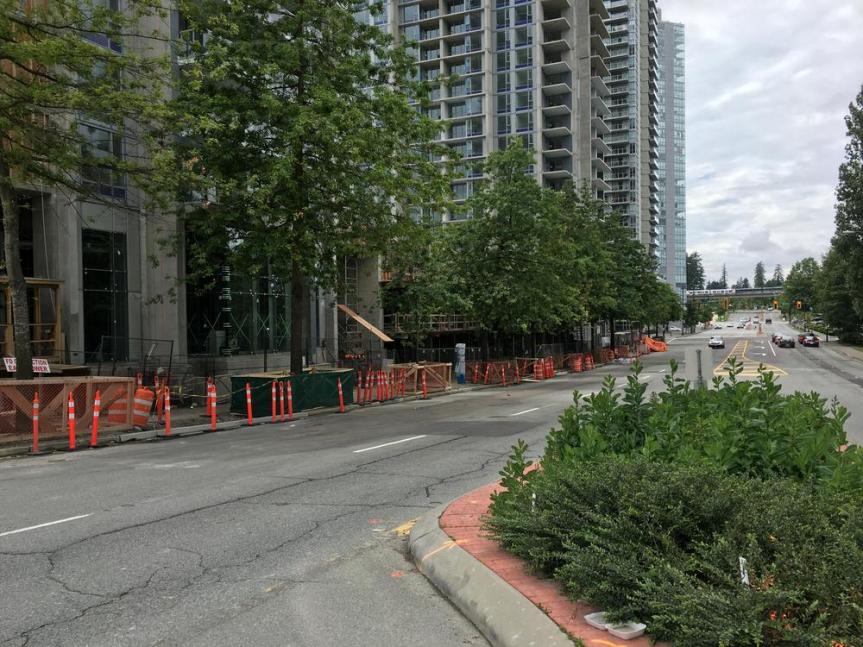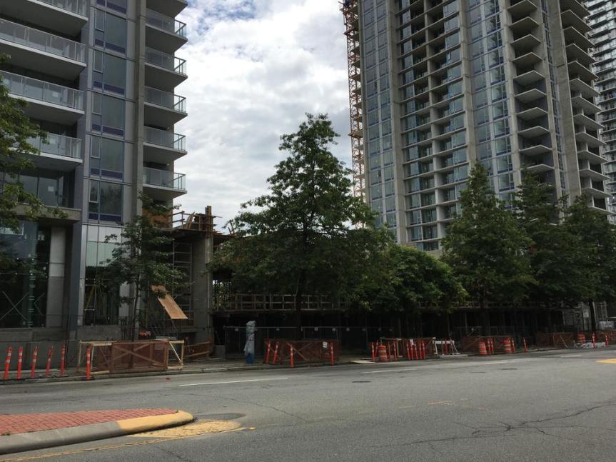 Concord Pacific’s Park Avenue is beginning to transform the look and feel of 100 Avenue. The East tower is now topped out with the West tower catching up. A row of townhomes that line 100 Ave between the 2 towers are beginning to form a nice streetscape with the mature tree canopy already in place. A new parking meter has also recently been installed indicating that there will be on-street parking which should help to buffer traffic from the sidewalk to create a better pedestrian environment.