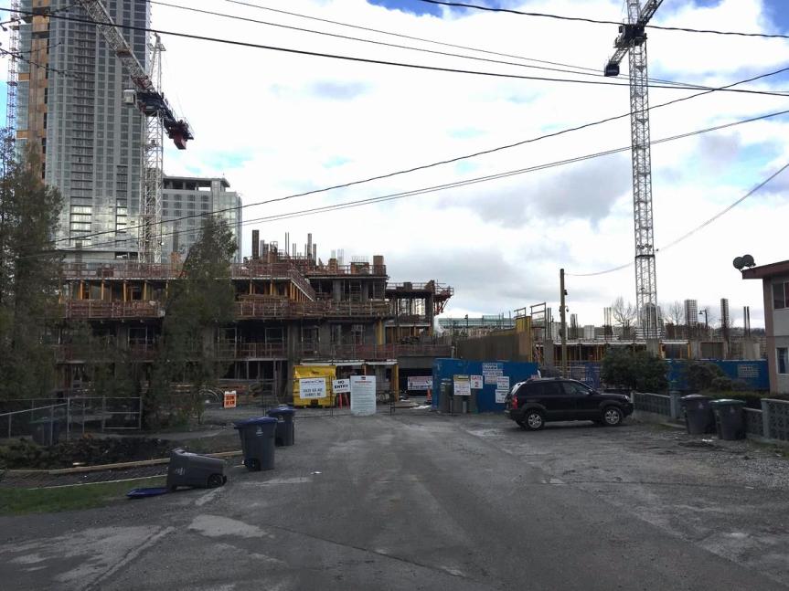Century City Holland Park (19-Storey Rental, 11-Storey Office) – Crane now up for rental tower Parkway 1 (38-Storey Rental) – Marketing fencing now up and drilling underway along 104 Ave One Central (44-Storey Condo, Retail) – View of podium from lane with main tower continuing to rise Plaza One & Two @ King George Hub (41 + 44-Storey Residential, Office, Retail) – First crane now installed Q5 (6-Storey Residential) – Underground parking levels construction underway University District (28 +37-Storey Residential, Retail) – View looking south along University Dr from 105 Ave The Holland (25-Storey Residential) – Tower gaining height above townhouse podium The Grand (46-Storey Residential, Office, Retail) – Excavation progressing Rosewood (5-Storey Residential) – Exterior cladding taking shape Belvedere (27-Storey Residential, Retail) – Excavation progressing Parc Centrale (20-Storey Residential, Office) – Now topped out at 20-Storeys