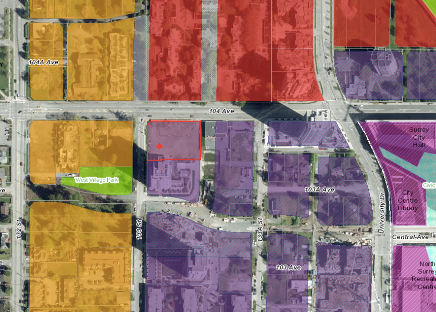 A development application has been submitted for a new mixed-use project on 104 Ave near Whalley Blvd. The subject site is made up of 3 existing properties that span the block between 104 Ave and Central Ave just east of Whalley Blvd. The site is currently occupied by a run-down early 1970’s strip mall known as ‘Plaza 104’.