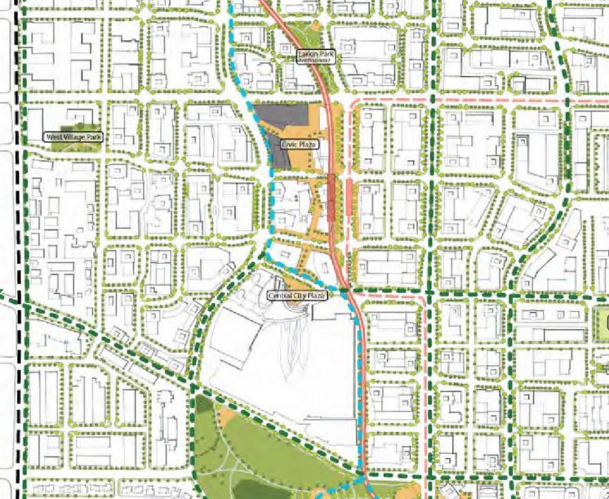 As part of the open house that was held, a number of display boards were presented that provided a preliminary concept of what the park may look like, with this likely to be modified based on comments received from the open house. The park is envisioned to be a ‘Contemporary Urban Place’ for neighbourhood residents to enjoy the outdoors, play, and bring their dogs. One of the boards also provided a glimpse of how this park will tie into a network of greenways, spaces, and parks throughout the city centre as it develops over the next few decades. This illustrative plan also gives a good impression of how the City Centre itself will transform over-time, with a finer grained street grid, and a more compact urban form. See below for images.