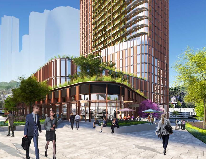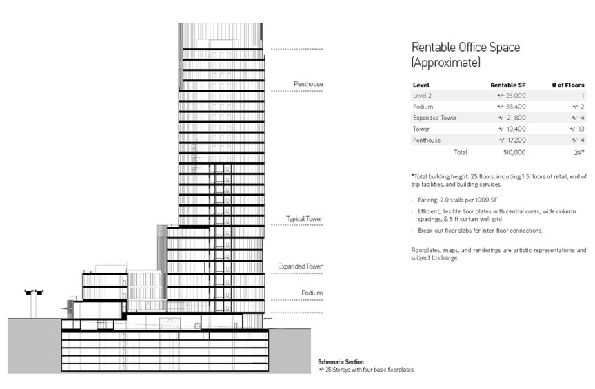 The proposed design of the tower has undergone considerable revision since first announced back in November 2017. The tower now features copper / reddish toned shading fins on its exterior, and a refined, more cohesive massing and podium. The tower also features expansive green roof decks, premium fitness facilities for office tenants, bike lockers, electric vehicle charging, high-speed elevators, and a ground level urban plaza, anchored by a restaurant, café, and retail.