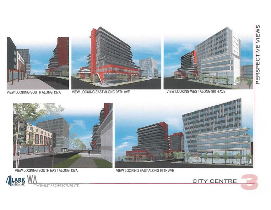 Perspective view looking north-east with 36-storey Evolve across the street View facing south-west from 133 St & Central Ave View facing north from proposed Public Pathway View facing north west from 133 St