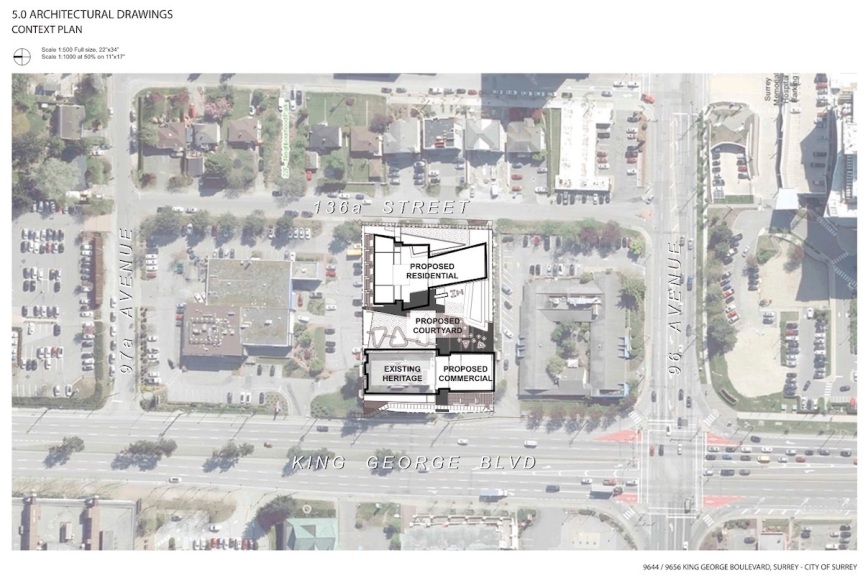Aside from the Heritage Revitalization Agreement for the North Surrey Medical Building, the proposal is seeking to Rezone the subject site from CHI to CD, Consolidate 2 lots into 1, and obtain a Development Permit in order to construct 276 residential units and 1486 sq. m. of commercial space. The new commercial space is to occupy a new ‘twin’ 4-storey podium consisting of ground floor retail and 3 floors of office – adjacent to and resembling the original 1960’s building.