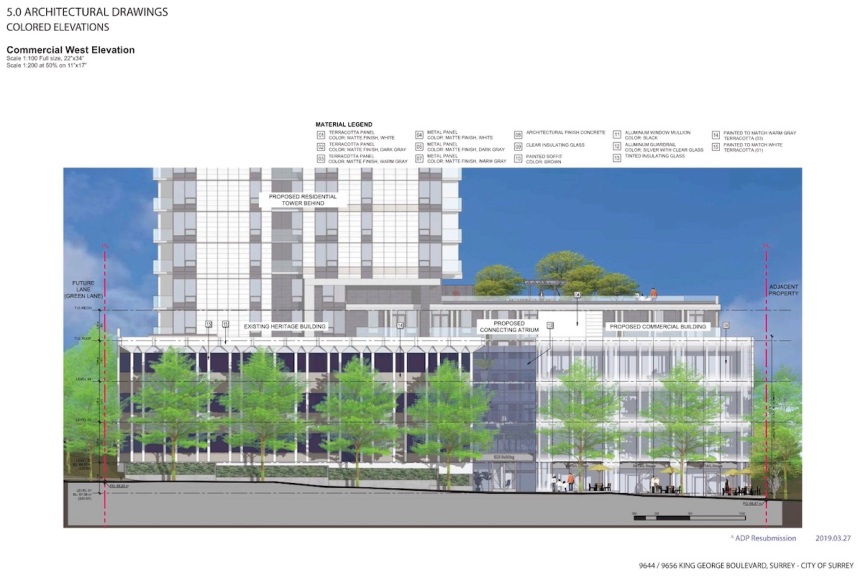 A heritage revitalization project being proposed by Vancouver developer Rize Alliance at 9656 King George Blvd just north of Surrey Memorial Hospital, received unanimous approval by Surrey’s Advisory Design Panel (ADP) on February 14. The project, which must still appear before Council for approvals, is proposing to restore the 1969-built North Surrey Medical Building, while adding a new ‘twin’ commercial podium, and residential tower to the site.