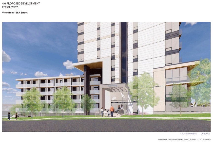 A proposal to revitalize the North Surrey Medical Building at 9656 King George Blvd in the emerging Health & Technology District is heading to Council on Monday for 1st & 2nd Readings. The project, by Vancouver’s Rize Alliance, is seeking to restore and integrate the 1960’s North Surrey Medical Building on site into a new mixed-use development consisting of a new 4-storey office and retail podium along King George Blvd, and a new 31-storey residential tower behind. The project was first reported on here back in February when it passed ADP.