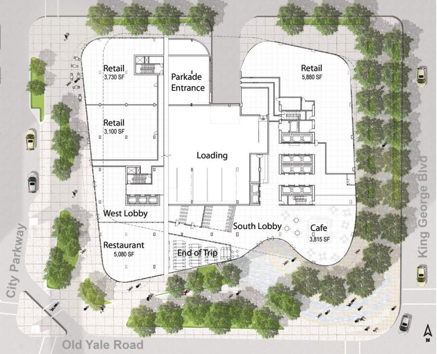 New plaza at corner of Old Yale Road & City Parkway Conceptual ground level floor plan Office tower views Premium fitness facilities for office tower tenants