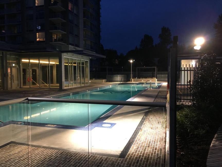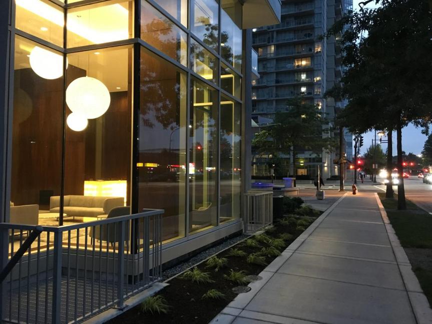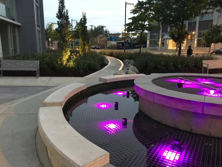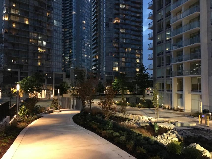 Standing at 39 Storeys tall, Park Avenue West not only adds another condo tower to the area, but also completes the the Park Avenue development, bringing with it a number of resort-style amenities, new public plaza space, walkways open to the public, lighting features, and a corner fountain with spotlights that illuminates the building in changing purple and blue tones at night. Park Avenue is the successor to the original 3 Park Place towers at King George Station, and is set to be followed by Park Boulevard which is expected to break ground by next year.