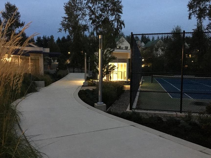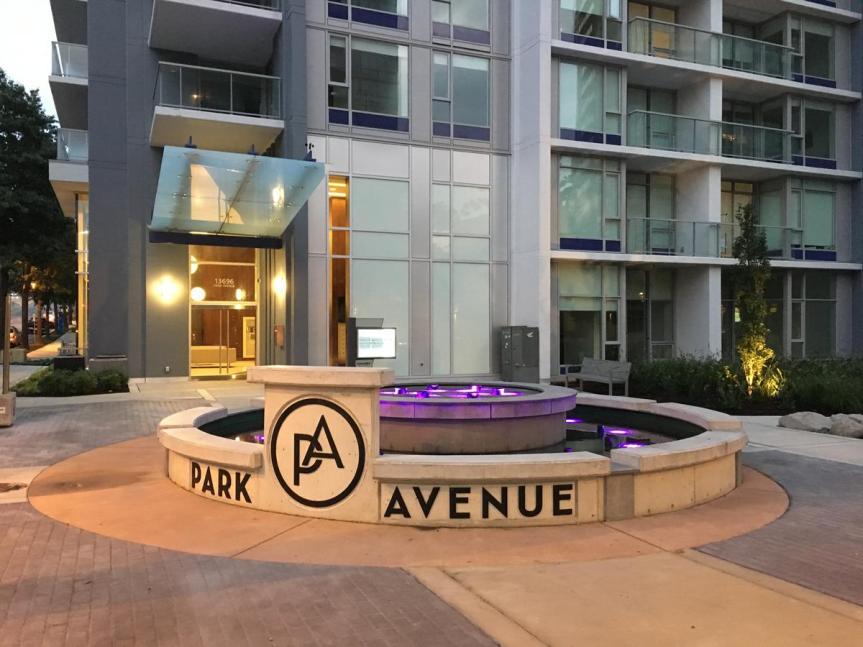 New corner fountain at Whalley Blvd + 100 Avenue featuring coloured spotlights. View west along 100 Avenue of Park Avenue West lobby View east on 100 Avenue of Park Avenue West entrance View of the Park Avenue parking access area New public pathway connecting to Whalley Blvd Parking Garage entry and pool deck to the right View further back along new public pathway Private pool within Park Avenue amenity area Horizontal lighting feature on top of Park Avenue West and East Pool deck within private amenity area Amenity area tennis court along new public path Park Avenue West and East as seen from King George Station Park Avenue West and East with Park Place in forefront from King George Station Purple toned lighting feature on Park Avenue West as seen from 100 Avenue