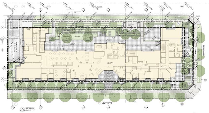 In total, the project will create a total of 117 new seniors living units in City Centre along with a 1,700 sq.ft. child care centre. In addition to the building itself, the project will also dedicate and build a new section of 109 Avenue to the south, and a new urban green lane to the east. These roads are required as part of the City Centre Plan.