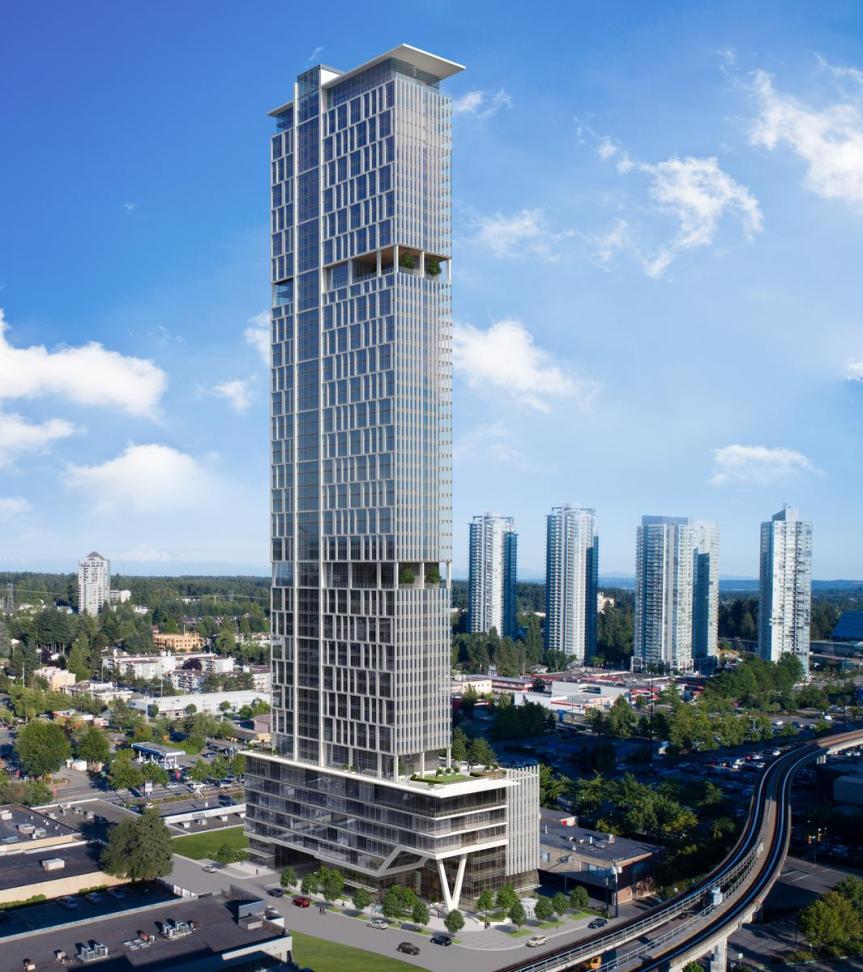 Designed by Architecture 49, the building features a unique form and massing, high-quality architectural design features, with substantial glazing and a high quality material palette, including an abstract pixelated image of a British Columbia landscape on the podium’s curtain wall glass.