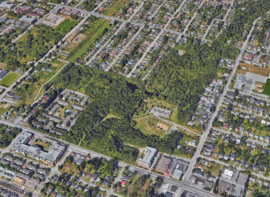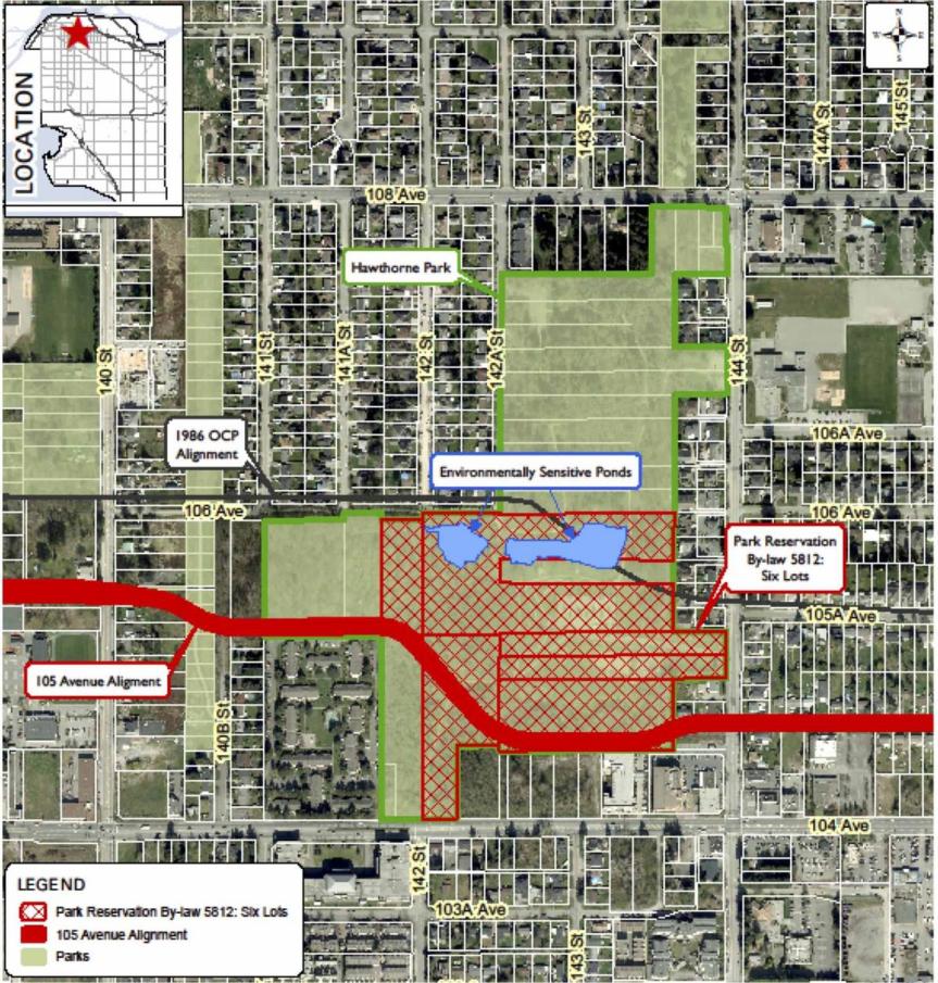 On Monday, Surrey Council authorized staff to move forward with an Alternative Approval Process to remove a 1979 bylaw reserving a portion of lands in Hawthorne Park for park purposes. The bylaw, which applies to 6 properties (shown on the map below), currently preserves the properties for park purposes. City Staff want to construct a new portion of 105 Avenue through the properties as part of an east-west connector road project which has been planned since the 1980’s. An ‘Alternative Approval Process’ will now move forward involving the public, with aim to remove the 1979 Bylaw and allow for the road’s construction.