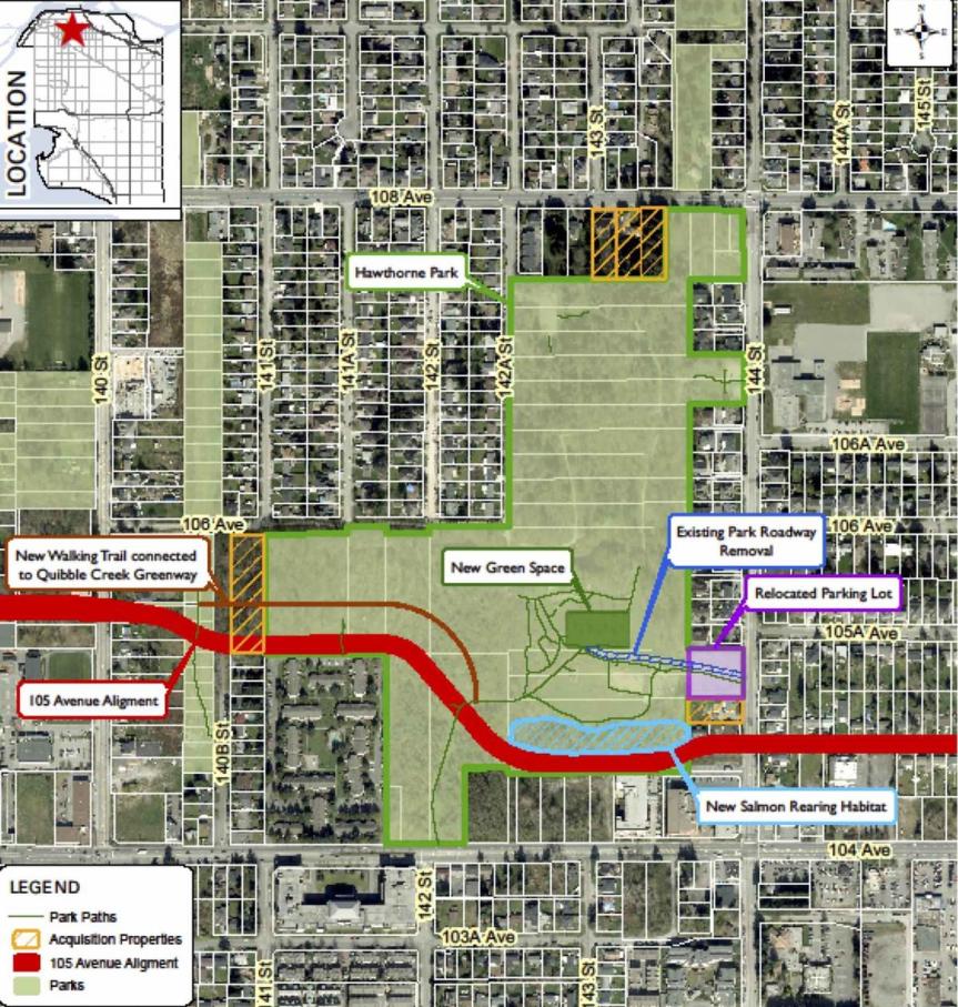 - 3 properties along 108 Avenue are proposed to be added to the park to make up for parkland lost by road construction. This will result in a net increase of 1 acre of parkland from what exists today (4 acres of park removed for the road, 5 acres of park to be added in exchange)