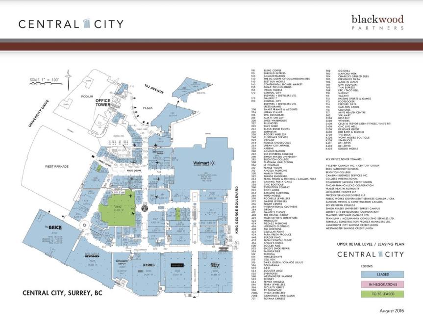 The remaining buildings, subject to future Detailed Development Permit applications, will be located further east along 104 Avenue and north along 105 Avenue. The tallest of the towers, the 50-Storey mixed-use building with 17-Storey office podium, would become the new tallest in Surrey once complete, assuming no other building surpasses it by then, at 554 ft. (169m). The two future low-rise amenity, and market-hall buildings located in the centre of the site are to be set within a publicly accessible plaza that will invite people into the site from 104 Avenue. The plaza will be activated by retail and restaurant spaces at grade, as well as landscaping, and public art, subject to future detailed design.