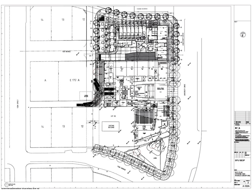 A Rezoning, Subdivision, City Centre Amendment, and Development Permit application has been submitted by IBI Group for a 42-Storey residential tower above ground-level retail at the corner of 133A St & 102A Ave just to the west of SFU. The application is proposing to consolidate 5 existing lots, currently occupied by a gravel parking lot, a vacant lot, and a four-plex to create 473 residential units above 3,762 SF of retail.