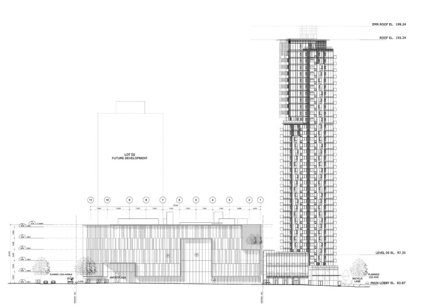 A Rezoning, OCP / City Centre Plan Amendment, and Development Permit application has been submitted by Chris Dikeakos Architects for a 49-storey residential tower above an 8-storey office podium with ground floor retail at the north-west corner of 102 Ave & King George Blvd. The project would replace an existing 1-storey strip mall and surface parking lot with 739 residential units and 223,545 SF of office space. The project will also dedicate land along the north side of the site for a new portion of 102A Ave, as well as land along the west side of the site for a new urban green lane.