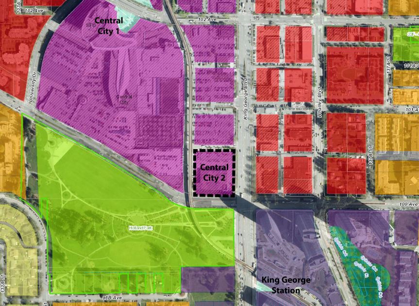 - Over the longer term, the Central City Mall property will redevelop to create a site that has improved interface and connection to Holland Park as well as a broader range of mixed of uses. The retail uses in the parking lot areas along King George Boulevard will intensify and include office and residential components.