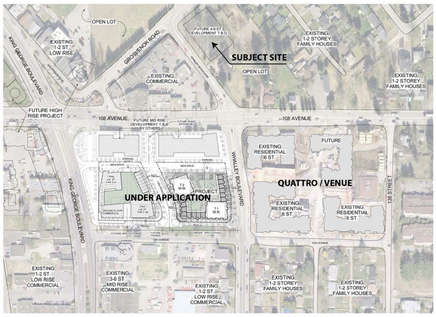 - King George Boulevard, between 102 Avenue and 104 Avenue, will emerge as a true “ Boulevard” , with the low intensity commercial and parking lot uses redeveloping into a street-facing downtown shopping area.