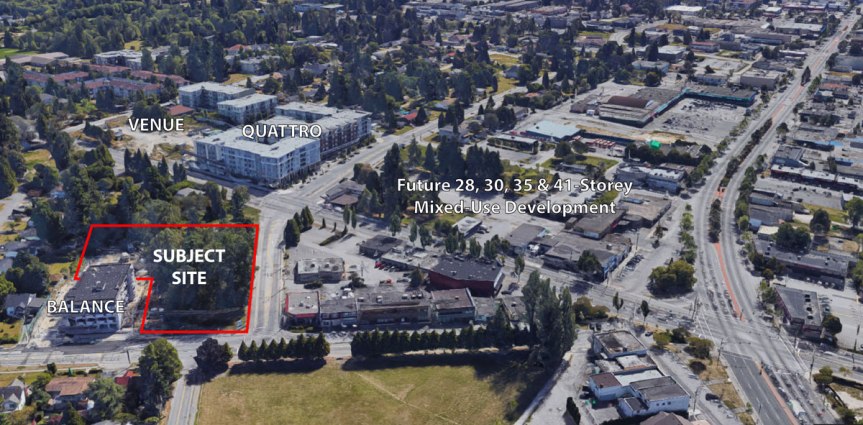A new development application has been submitted to the City of Surrey by Chris Dikeakos Architects Inc. to develop a new 46-storey mixed-use tower at 10297 133A St in the rapidly-changing West Village neighbourhood of Surrey City Centre. Details of the application at this time indicate that 551 residential units are proposed within the tower, along with 4491 sq.ft. of commercial & retail space at ground level. The development would complete the block occupied by the neighbouring 35-storey ‘Ultra’ tower, and the currently under-construction 36-storey ‘Evolve‘ tower, designed by the same Architect.